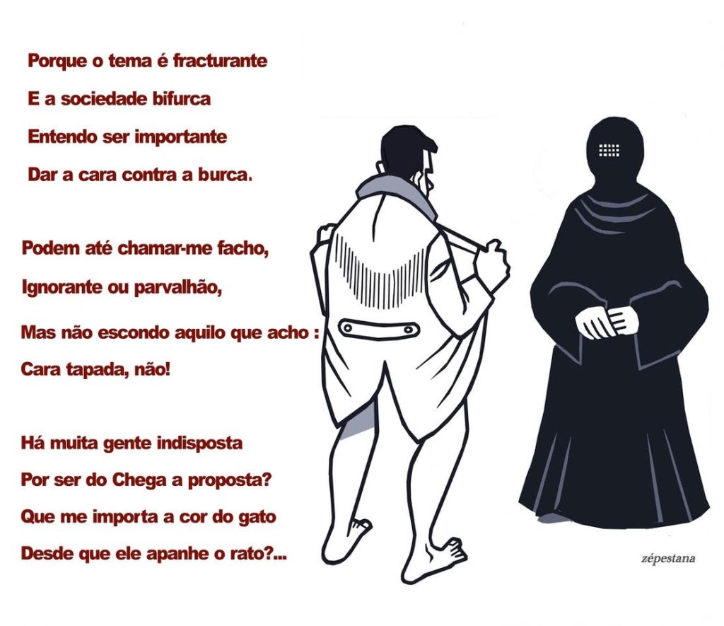 Perguntem ao “Ministério para a Propagação da Virtude e a Prevenção do Vício” (Afeganistão), e ele logo vos dirá, entre duas bastonadas, que a ocultação da cara e dos cabelos concretiza a mais sublime expressão feminina das qualidades de modéstia, respeito e obediência (leia-se auto-cancelamento, subalternidade e servidão), atributos que as mulheres ocidentais, fartas de paternalismos prepotentes, desde há muito desdenham.