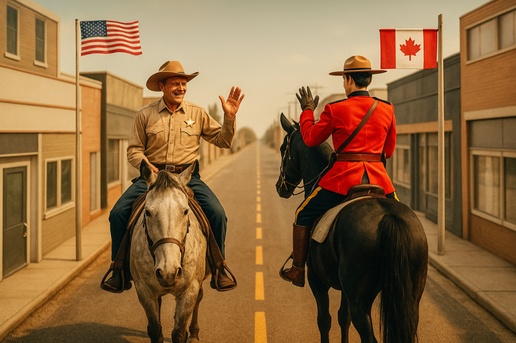 “Canussa Street” é o nome dessa artéria, assim chamada por fundir as abreviaturas de Canadá (Can) e Estados Unidos (USA).
